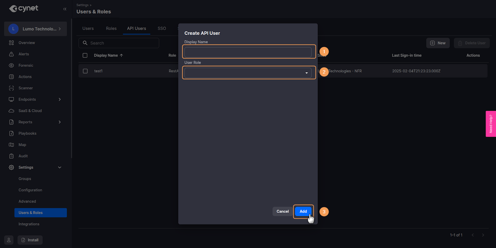 3. In the panel that opens, fill in the data following these guidelines:a. Under Display Name(1), provide a distinctive name for the API user.b. Under User Role(2), enter the name of the user role created in the Create an integration role section.c. When finished, click on the Add(3) button to save your integration user.