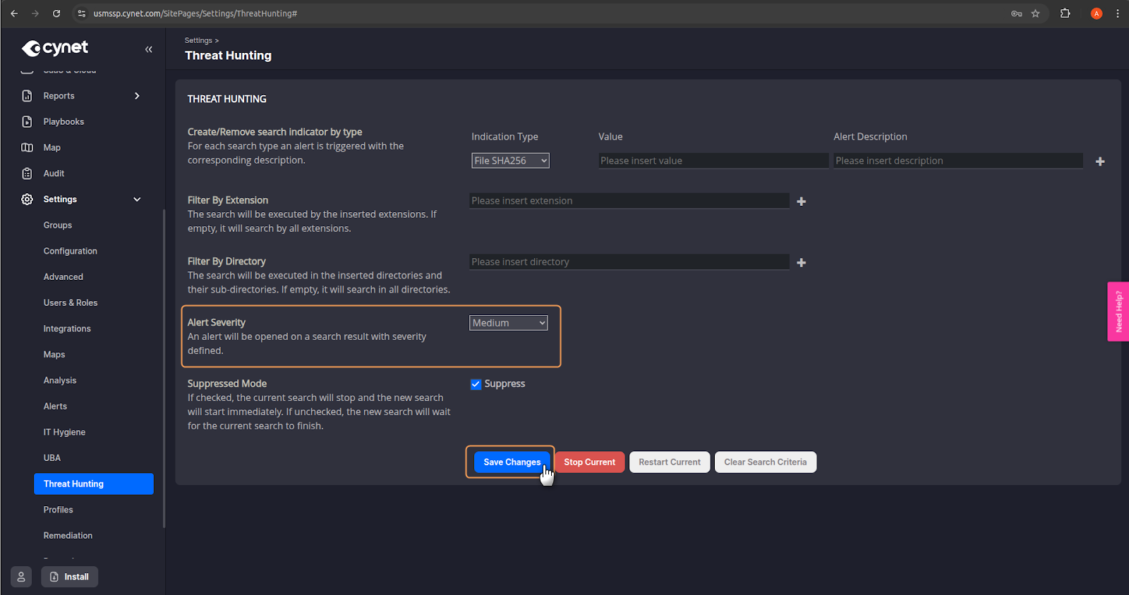 2. In the Threat Hunting window, look for the Alert Severity field. Select the most suitable value for your security operations. Click on the Save Changes button when done.