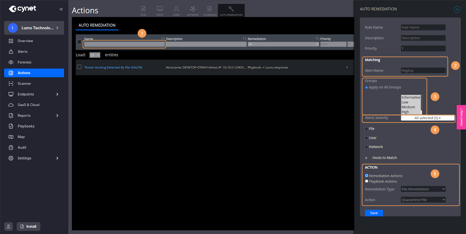 3. Fill in the required information. Follow these guidelinesa. Under Name(1) enter a descriptive name.b. Under the Matching > Alert Name(2) field, type Threat Hunting Detected By File SHA256c. Select the device groups(3) you want to apply the remediation rule to.d. Select the Alerts Severity(4) based on the configuration made in the Threat Hunting modulee. In the Action section, select PlayBook Actions(5). Select the playbook created in the previous stepf. Click on the Save button when done.