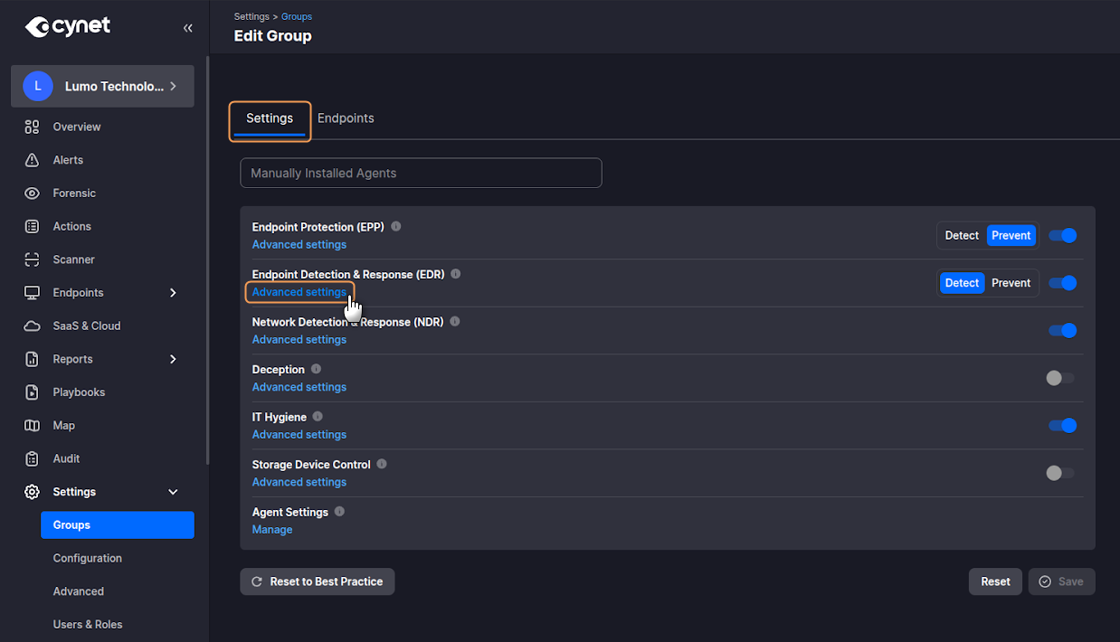 3. In the Settings tab, click on the Advanced settings link under the Endpoint Detection & Response (EDR) section.