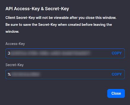 4. The API Access-Key & Secret-Key window will appear. Take note of the Access-Key and the Secret-Key field data and keep them on hand, these will be required later to configure the integration.