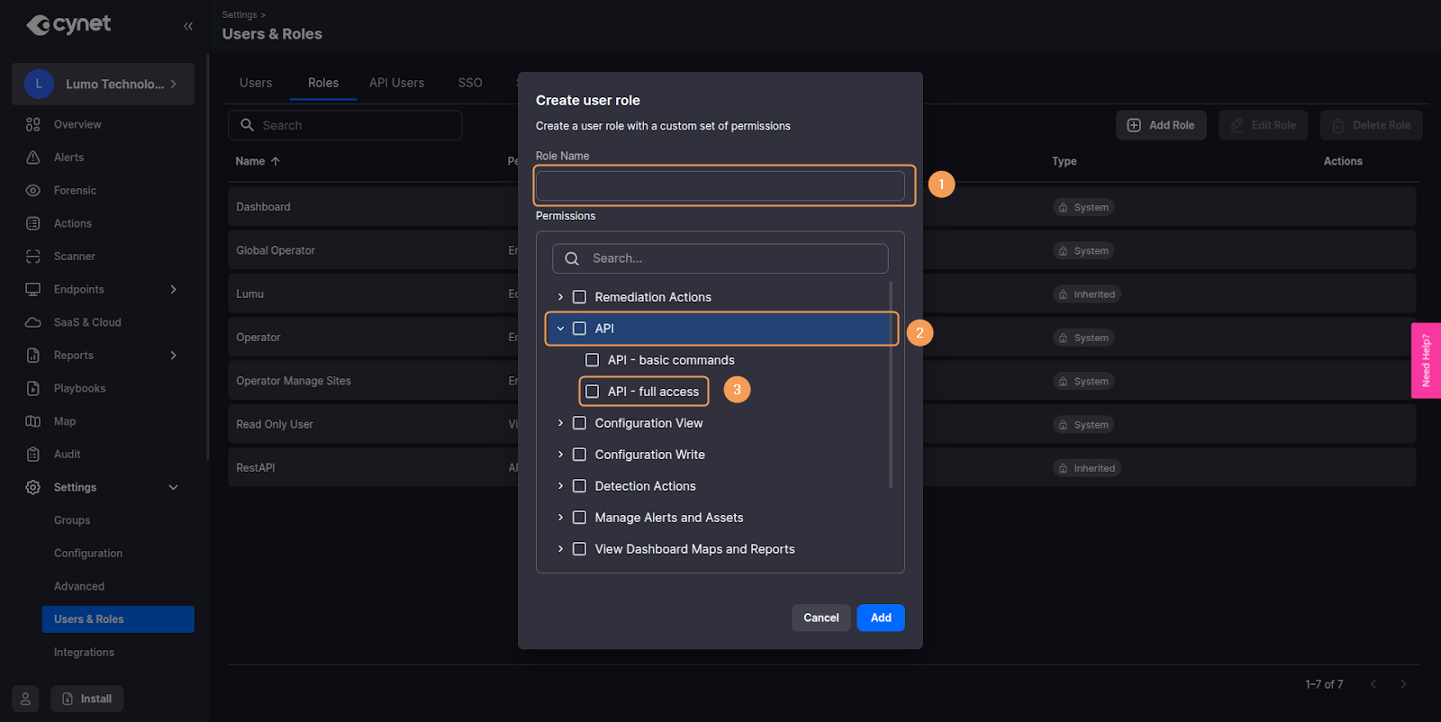 3. On the panel that opens, enter the following information:a. Under Role Name(1), provide a distinctive name for the role.b. In the Permissions list, unfold the API(2) dropdown, and select the API - full access(3) permissionc. Once you’re done, click on the Add(4) button to save your new role.