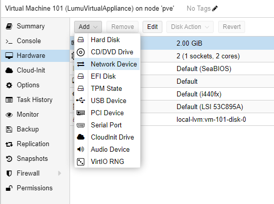 4. Add a network interface to your LumuVirtualAppliance . Go to the Hardware section, click the Add button, and select Network Device . Add the device according to your environmental conditions.