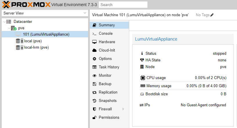Wait until the process finishes. Then, go to your Proxmox console and check the LumuVirtualAppliance information.