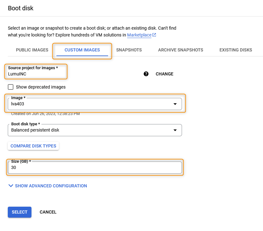 4. Go to the “Custom Images” tab, change the source project to "LumuINC" and select the image of the virtual appliance shared by Lumu from the “Show images from” drop-down list, then click “Select”.