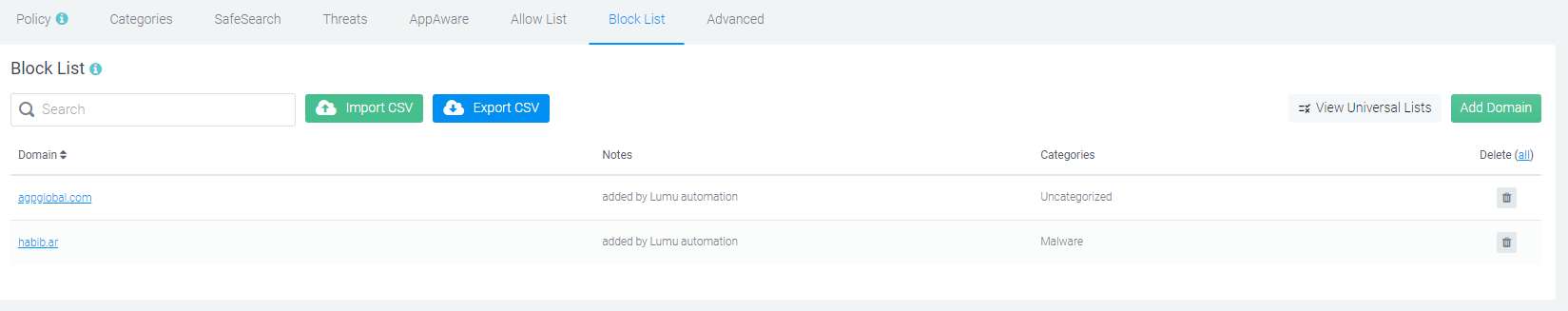 After running the integration, you will see new domains in the Block List tab inside the selected policy.