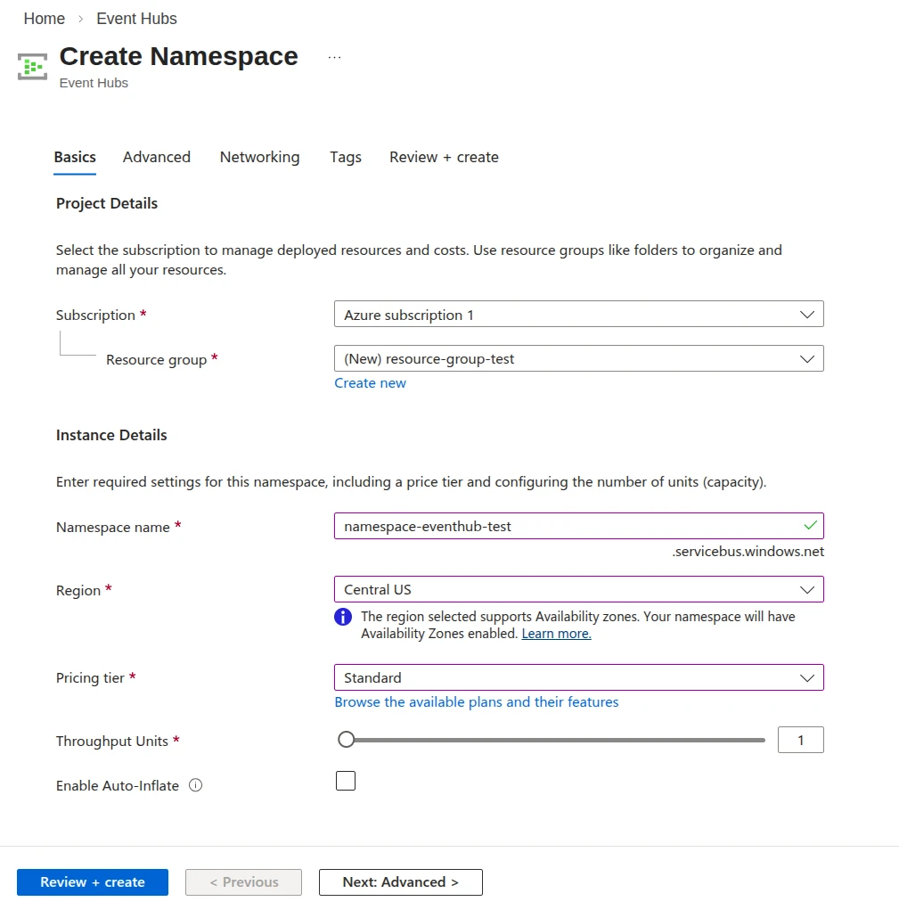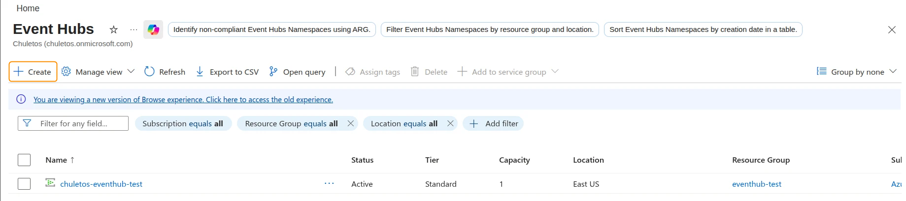 2. Then, click Create to create the namespace where the Event Hub is going to be configured.