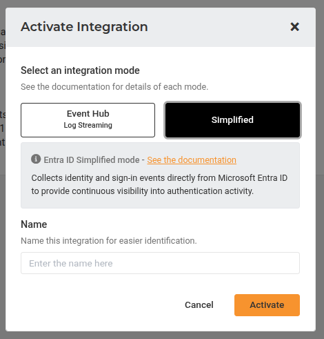 1. Select Simplified as your integration mode and give a distinctive name for the integration. Then, click Activate.