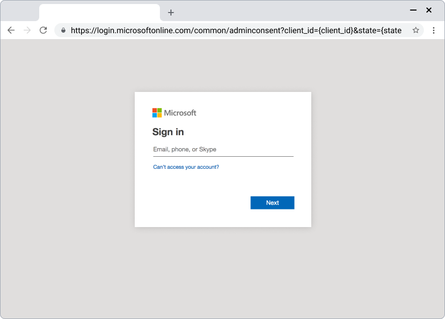 5. You will be redirected to the Microsoft sign-in page. Use an administrator account, only an administrator has the required permission to complete the integration.