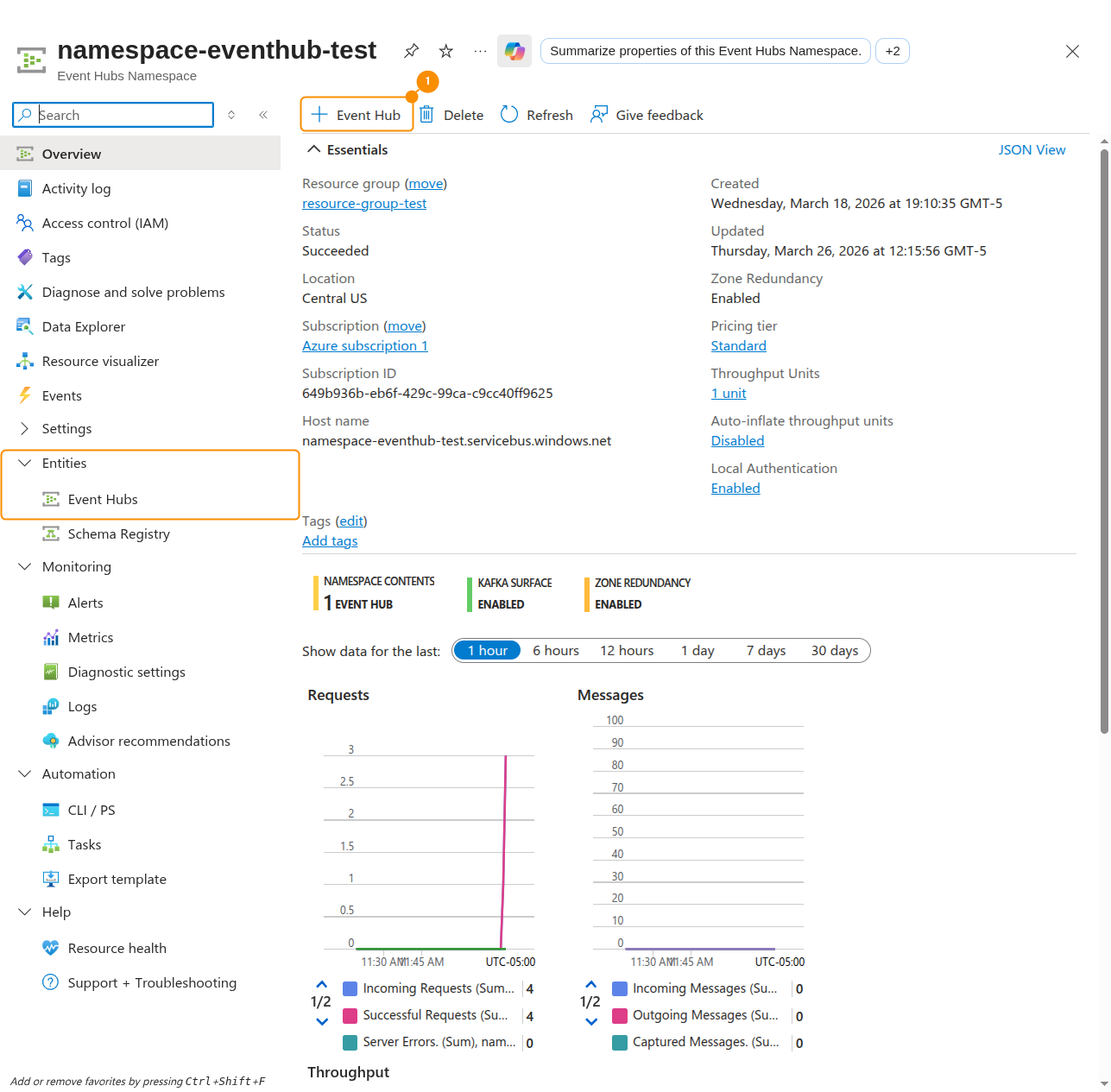 1. From the left-side panel, go to Entities > Event Hub and click on Event Hub (1).