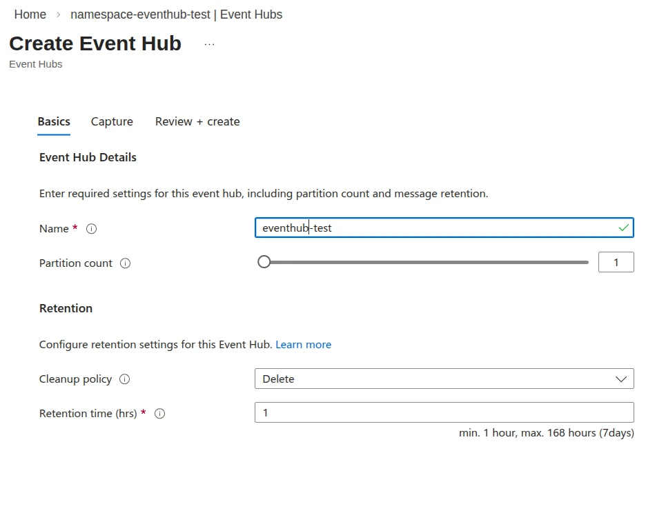 2. Configure the event hub as follows: