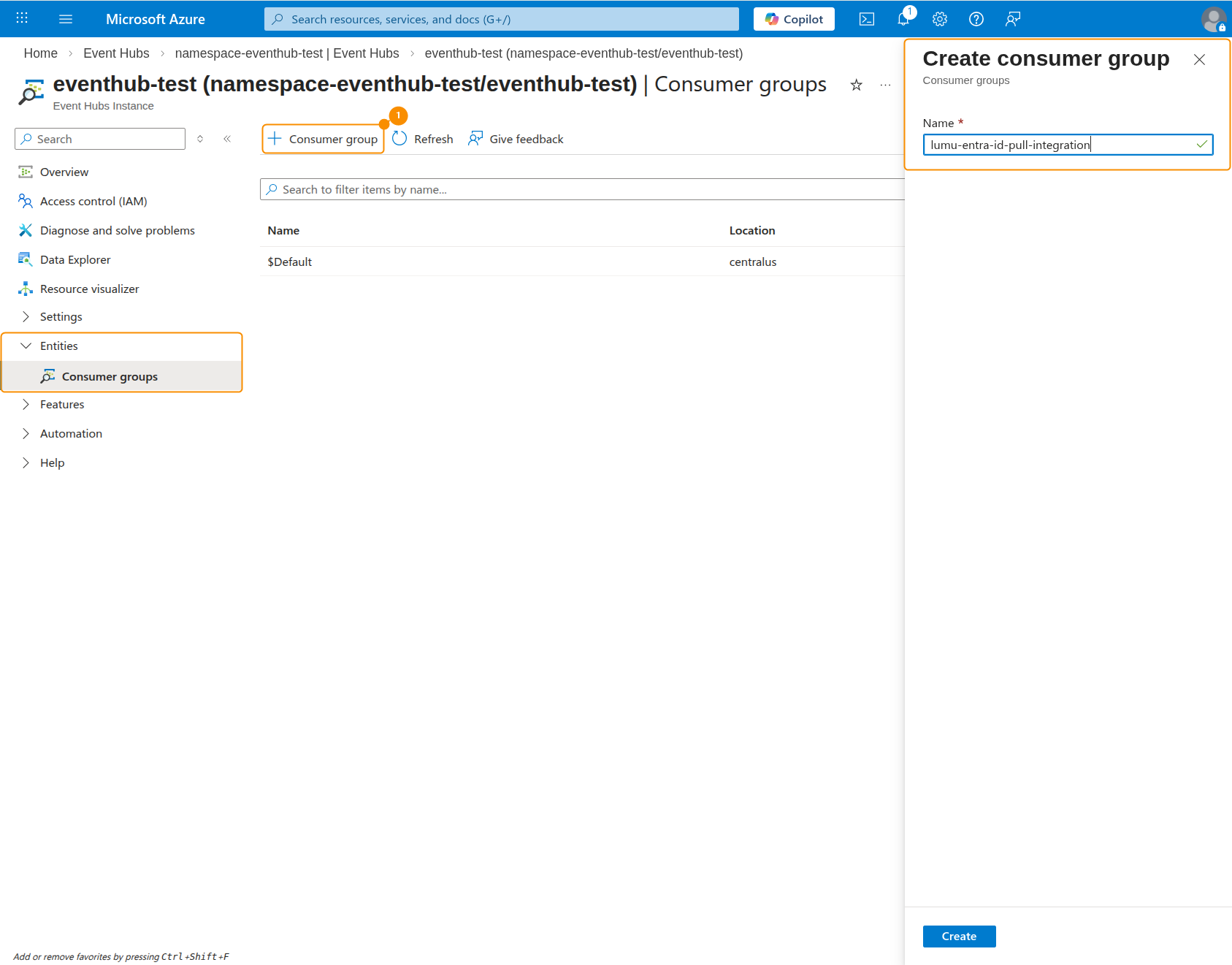 3. Once you create the event hub, go to Entities > Consumer Groups and click on Consumer group (1) to add the following name: lumu-entra-id-pull-integration