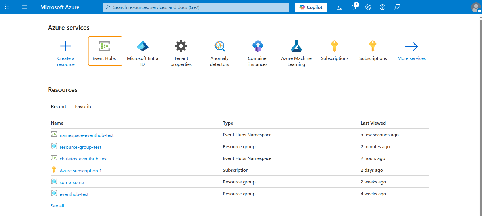 1. Log in to the Azure Portal and access Event Hubs. You can use the search box at the top of the Azure portal to find it if it is not already listed.