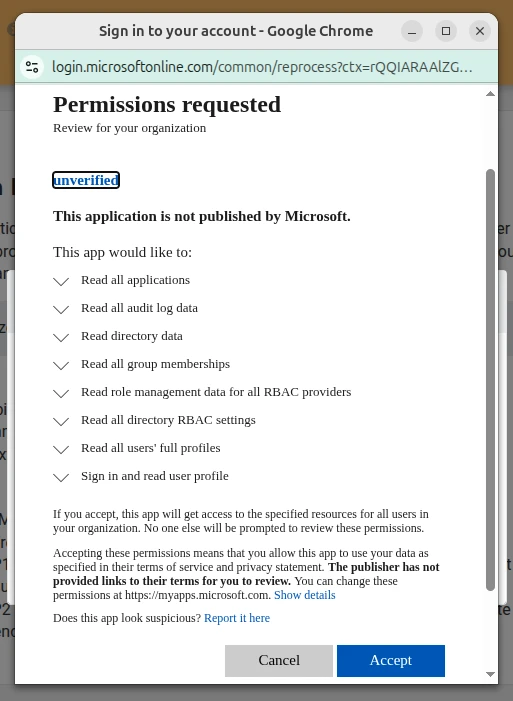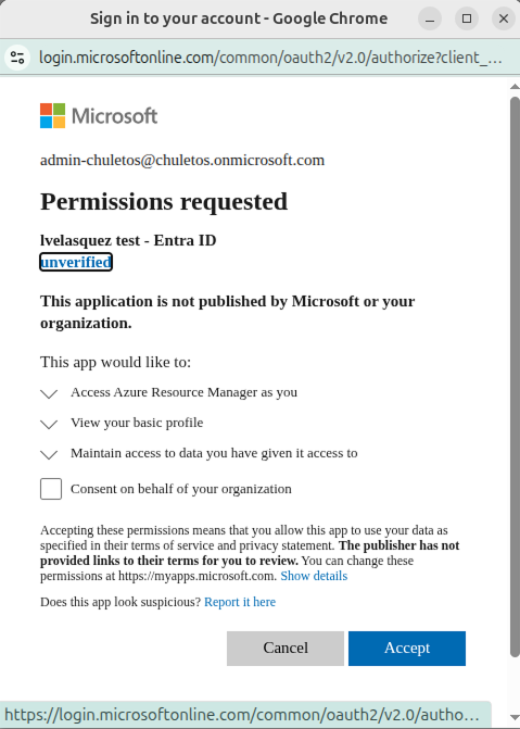 2. You will be required to accept new permissions. Click on Consent on behalf of your organization and then click on Accept.