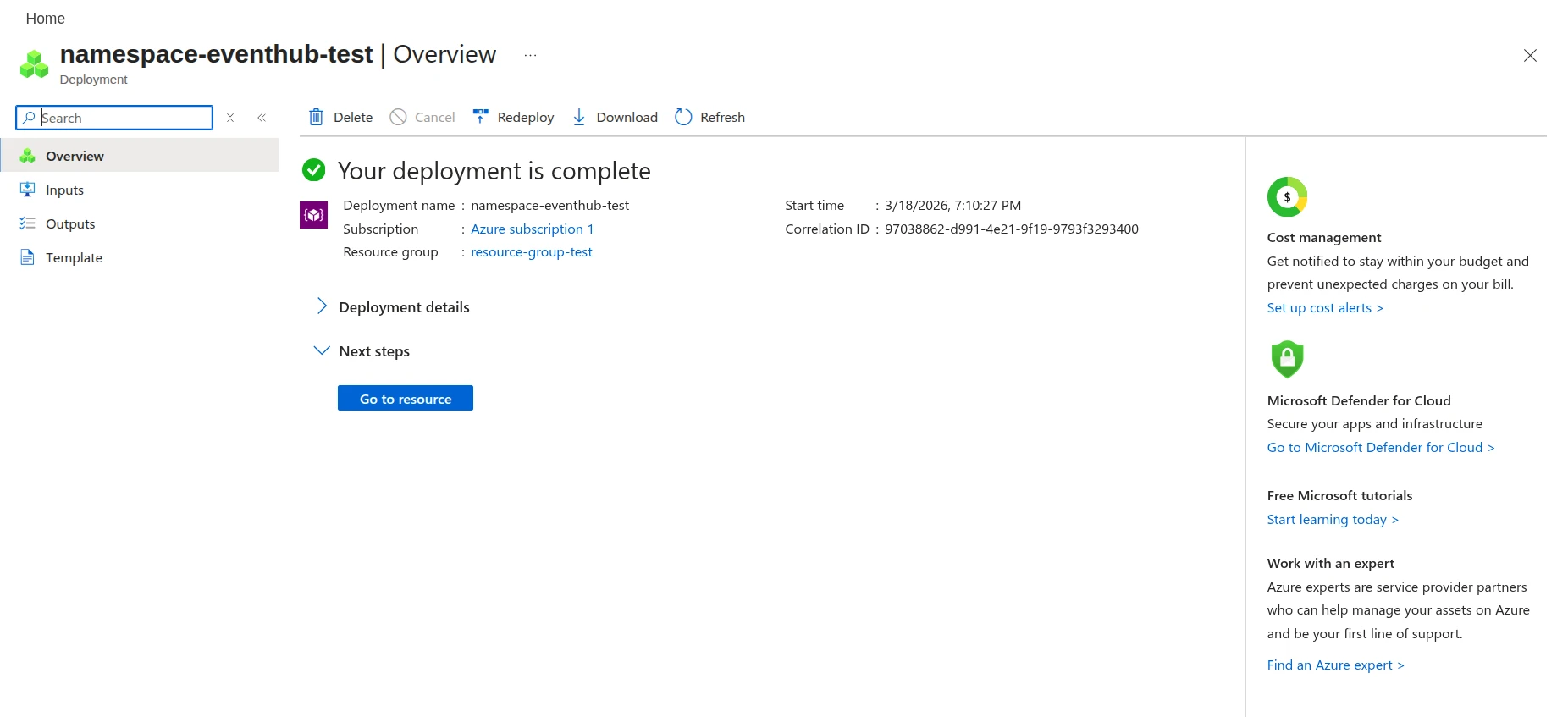 4. Select the Namespace name and Resource Group selected during the Namespace Creation step. Then, click Next.
