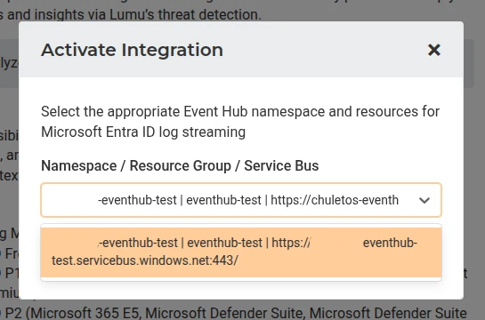 5. Now select the event hub you created during the Event Hub Creation step and click Activate.
