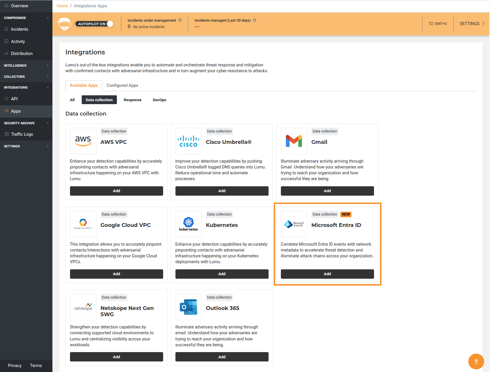 1. In the Lumu Portal, head to the left panel and select Integrations > Apps. Then, click on the Data Collection tab.