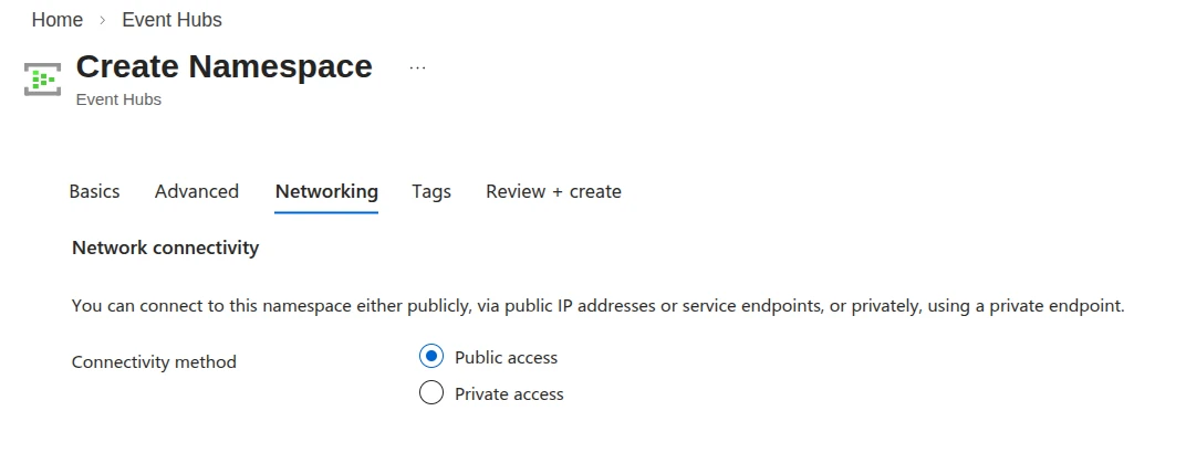 4. Go to the Networking tab and select Public Access as the Connectivity method.