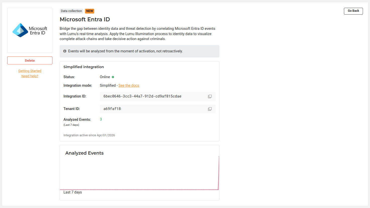 2. Once you activate the integration, the Lumu Portal will display the details of the newly created integration.