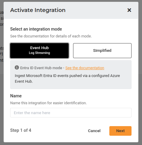 1. Select Event Hub as your integration mode and give a distinctive name for the integration. Then, click Next.