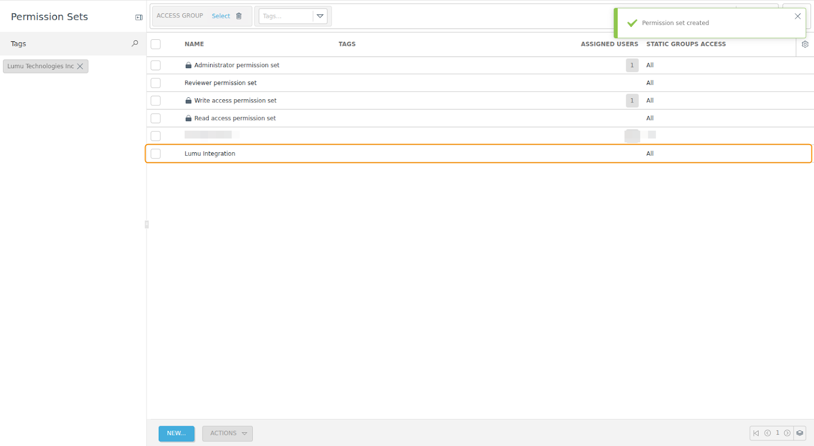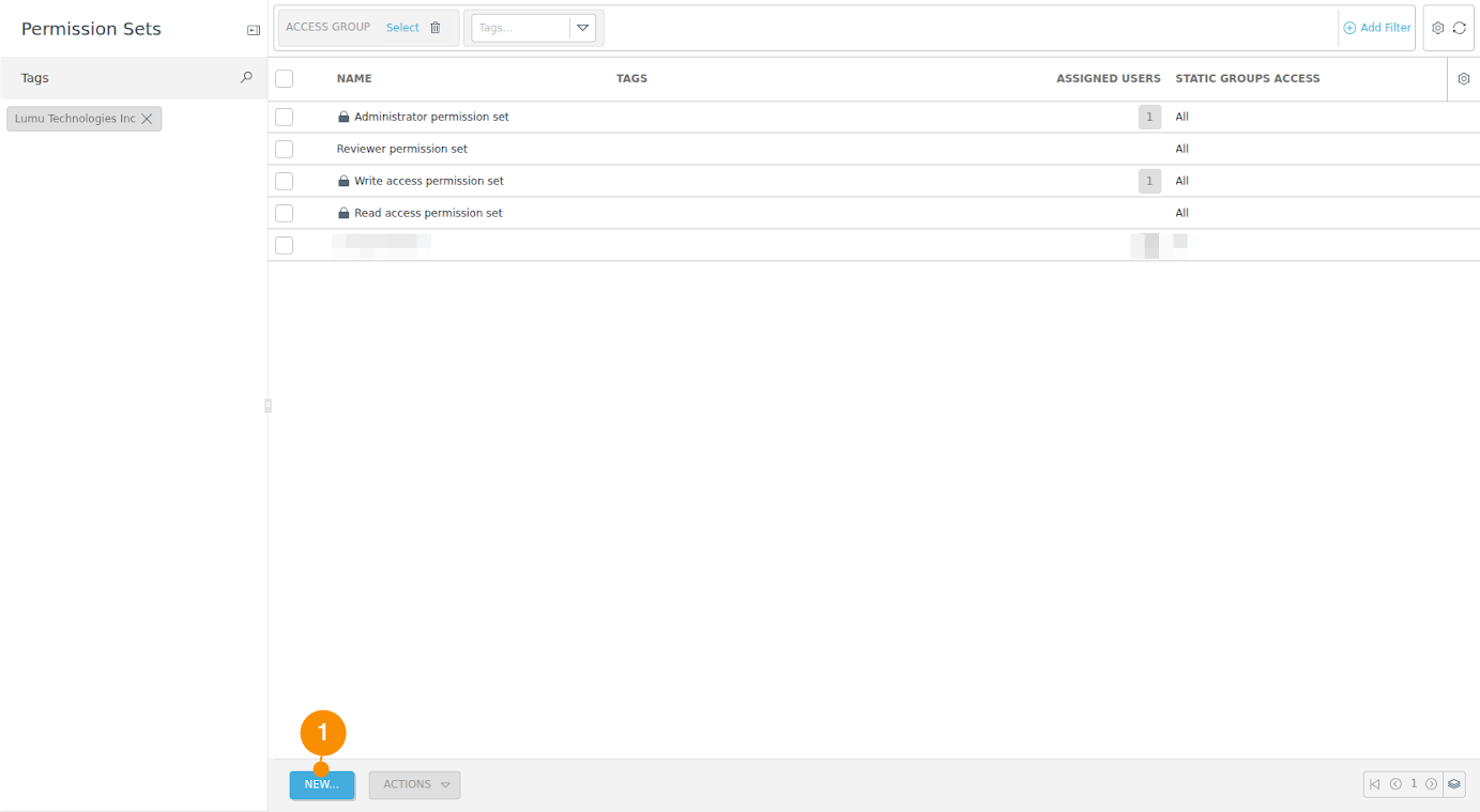 2. In the Permission Sets window, click on NEW (1) at the bottom of the screen. The New Permission Set window will appear.