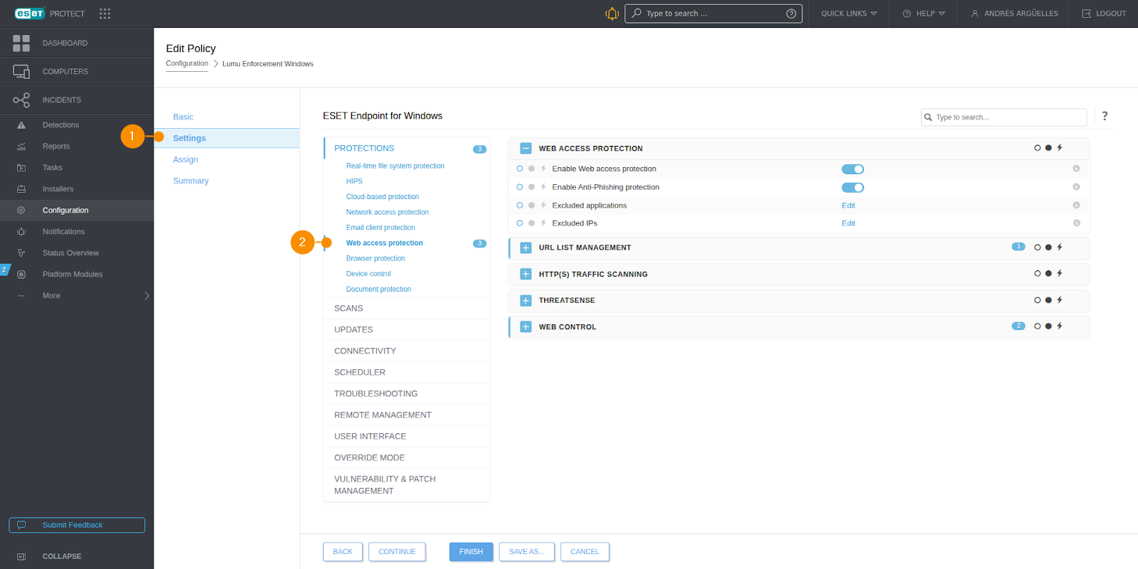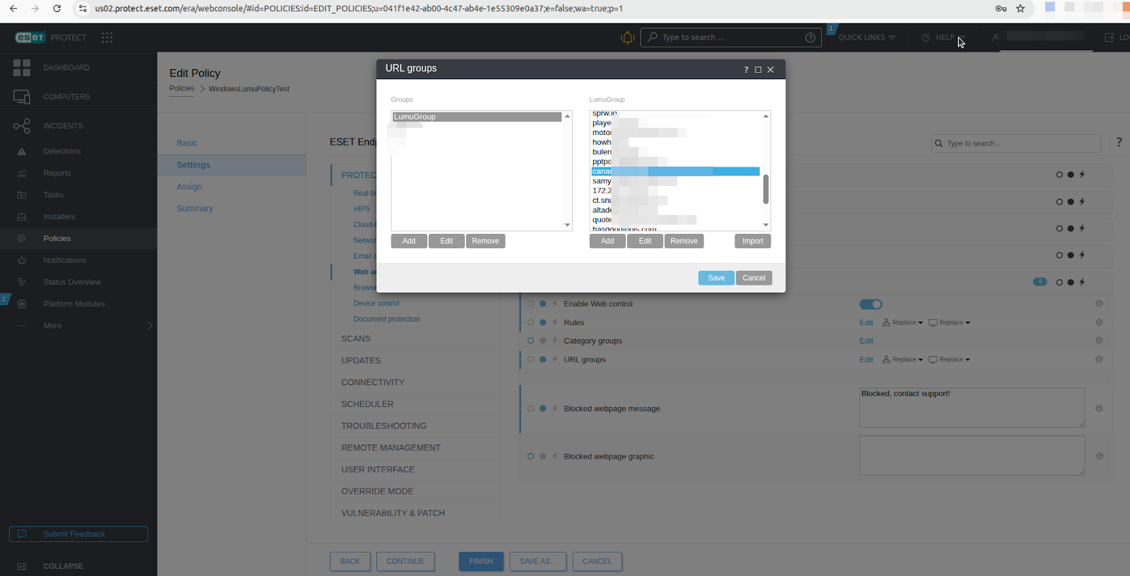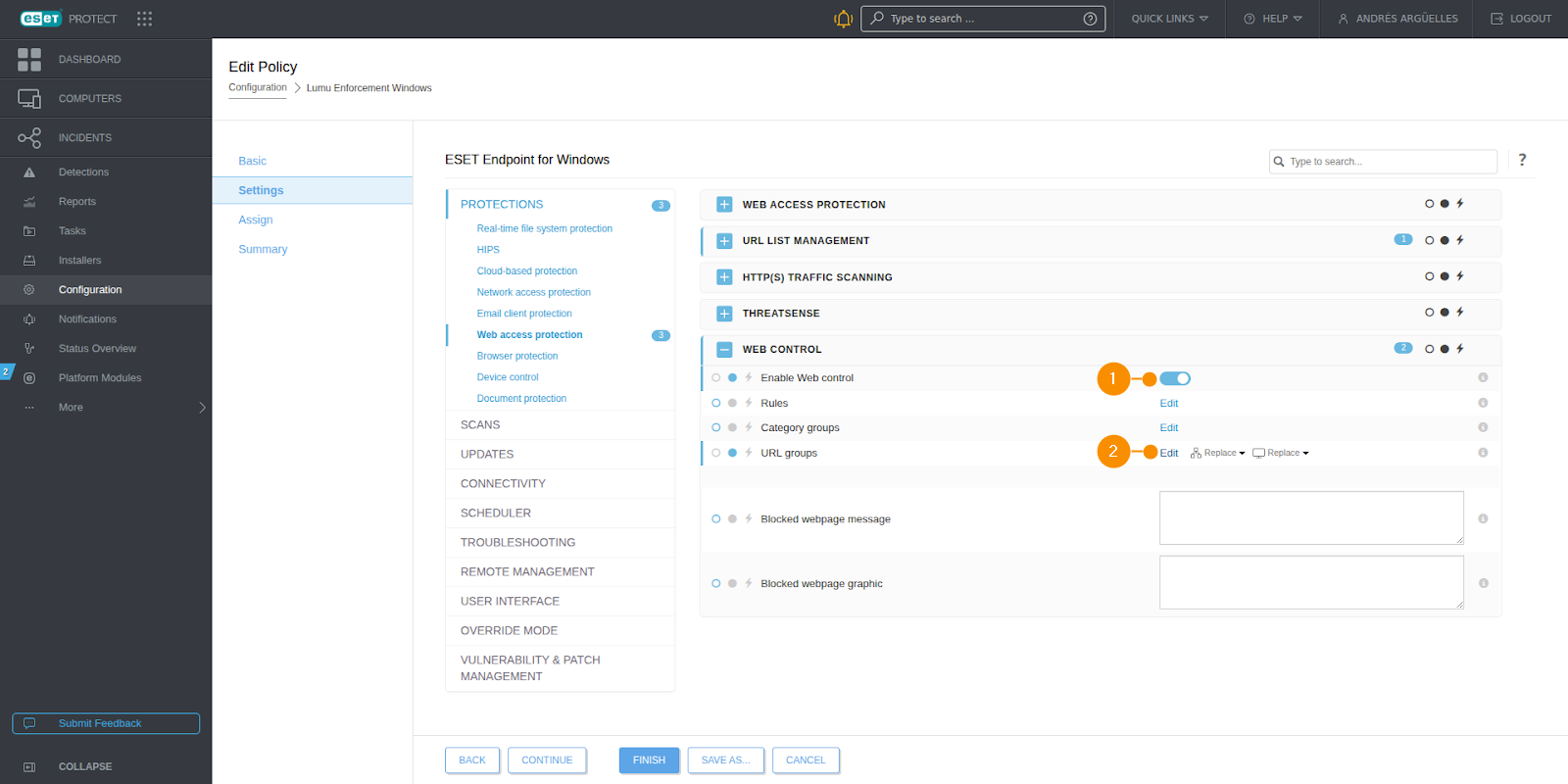 First, you must check if the web access protection module is enabled in the policy. Then, you need to enable the web control feature and add an integration URL group. Continue where you left off on the previous step, in the Edit policy window, and follow these steps: