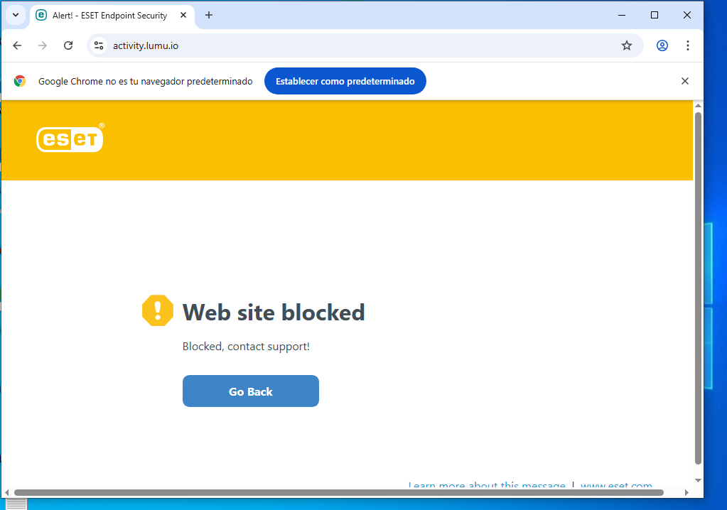 You will see the following block screen after you link this policy to Windows devices for each connection attempt to Lumu-related network IOCs.