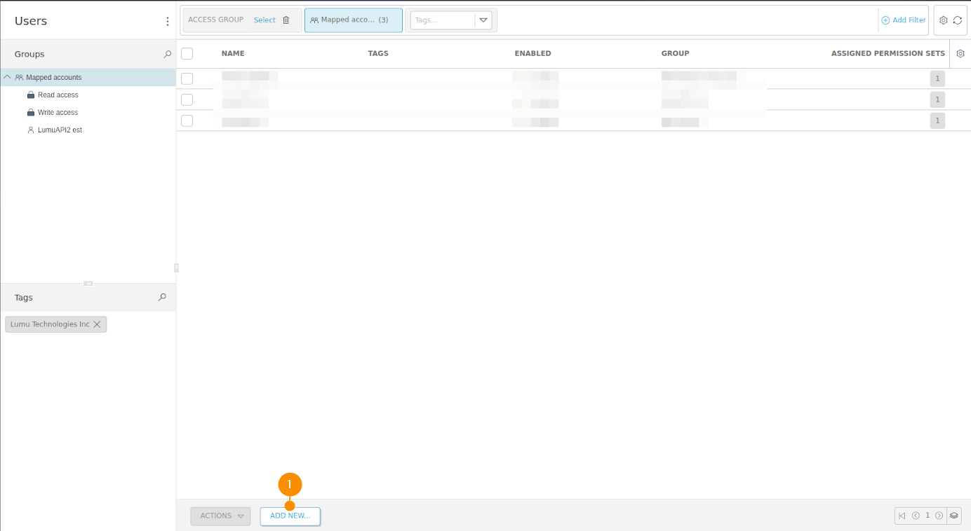 2. In the Users window, click on ADD NEW (1) at the bottom of the screen. The New Permission Set window will appear.