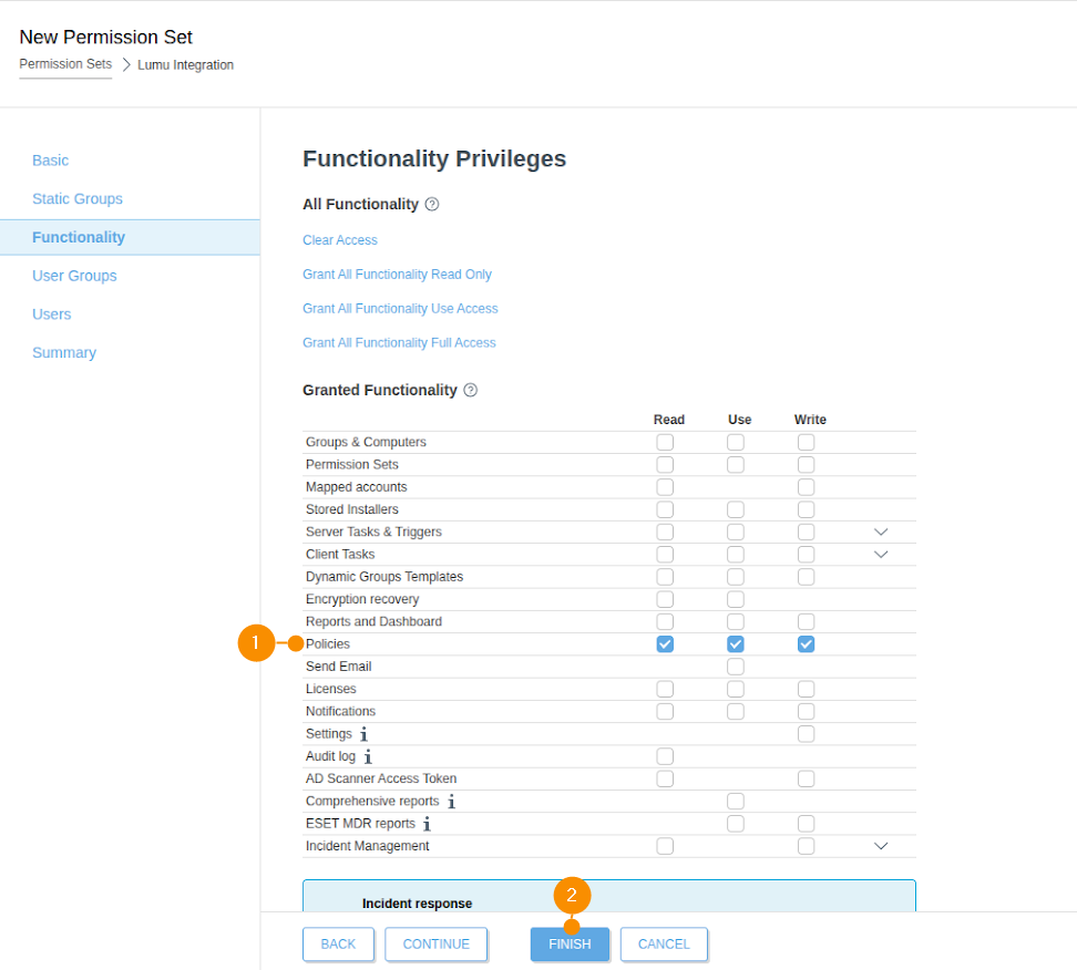 The integration script will need permissions to Read, Use, and Write policies. To create a permission set with these features, log in to your ESET PROTECT Cloud portal and follow these steps: