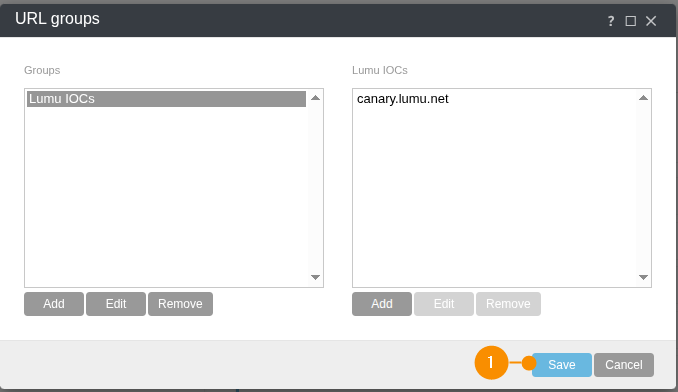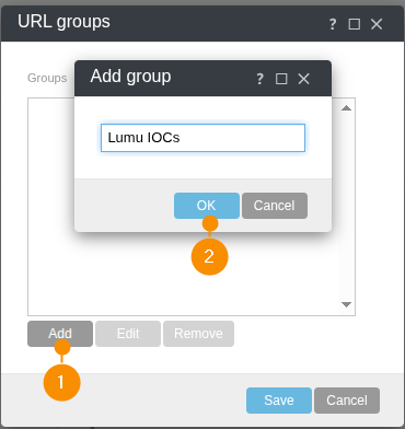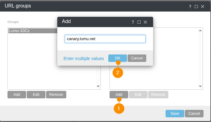 4. On the URL groups window, click on the recently created group. The window will expand to show the group IOCs, which will initially be empty. Click on Add (1) and type in canary.lumu.net in the Add pop-up window. Finish by clicking the OK (2) button.