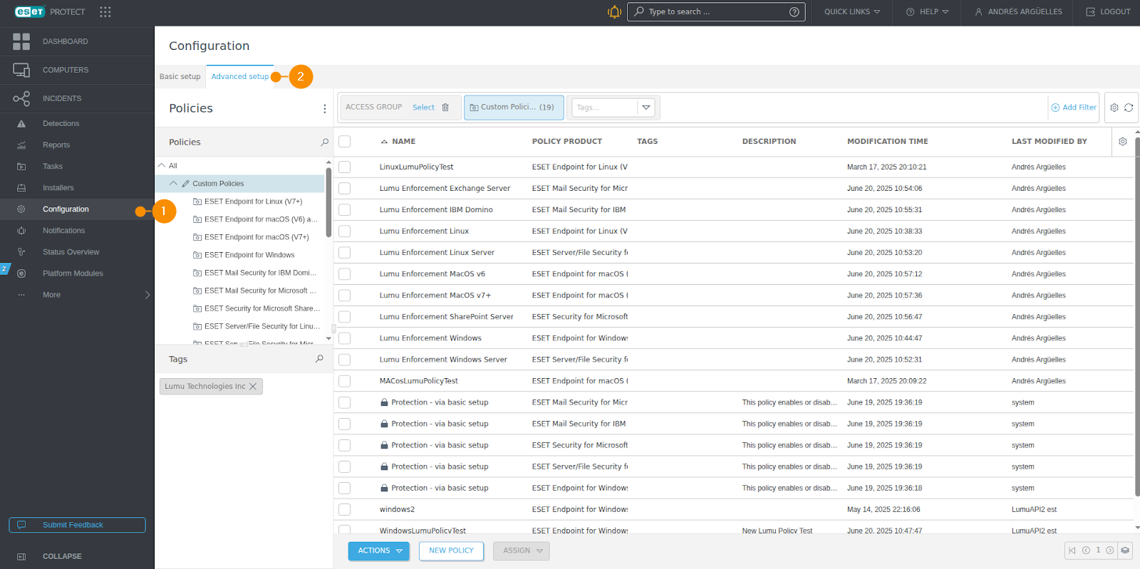 1. Click on Configuration (1) in the navigation menu. Then, click on the Advanced Setup tab (2) to access the Policies window.