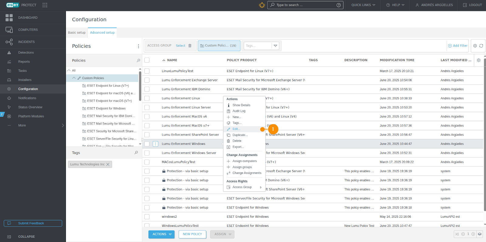 2. Locate and click on the policy you want the Lumu integration to manage to open the contextual menu. Then, click on Edit (1) to open the Edit Policy window.