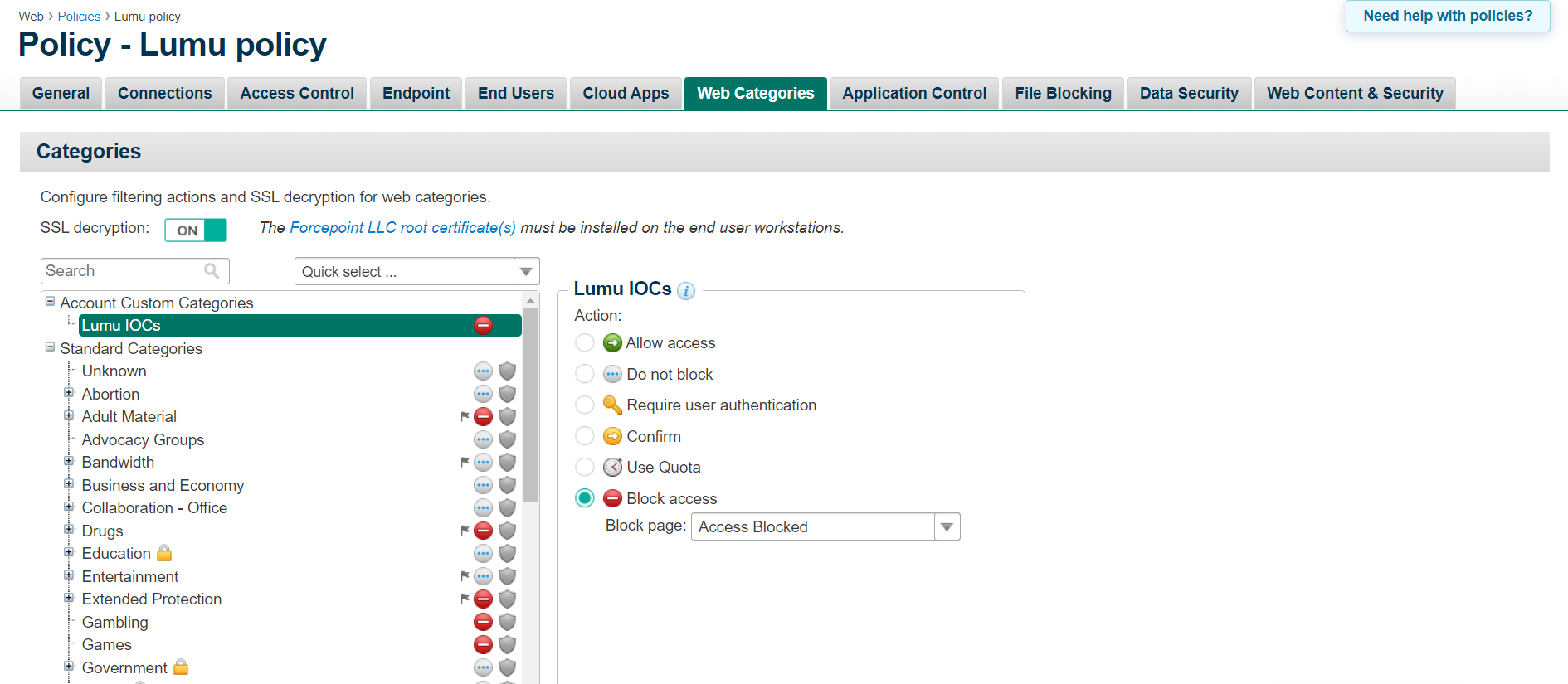 You need to add the custom category to a policy marking it to Block access . It's recommended to leave a dedicated custom category for Lumu.