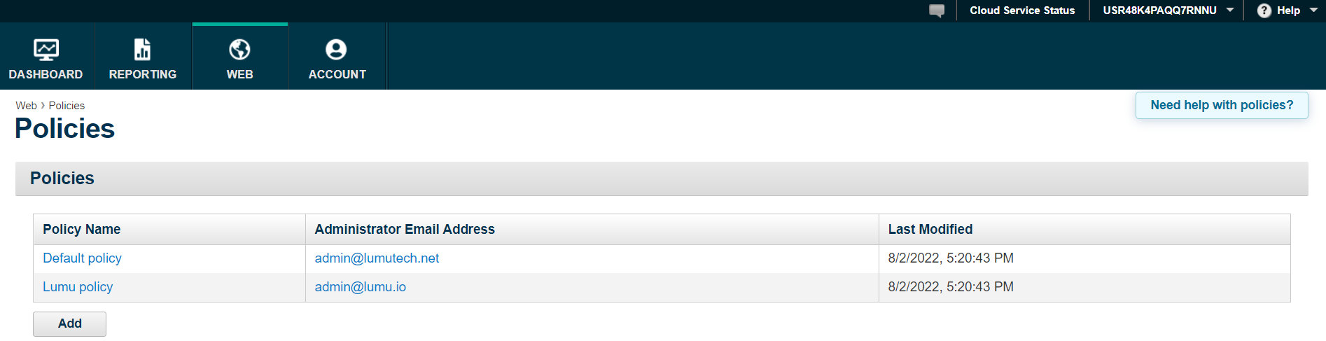 To create a dedicated contact in Forcepoint Web Security for Lumu integration, please refer to Forcepoint - Adding a contact .