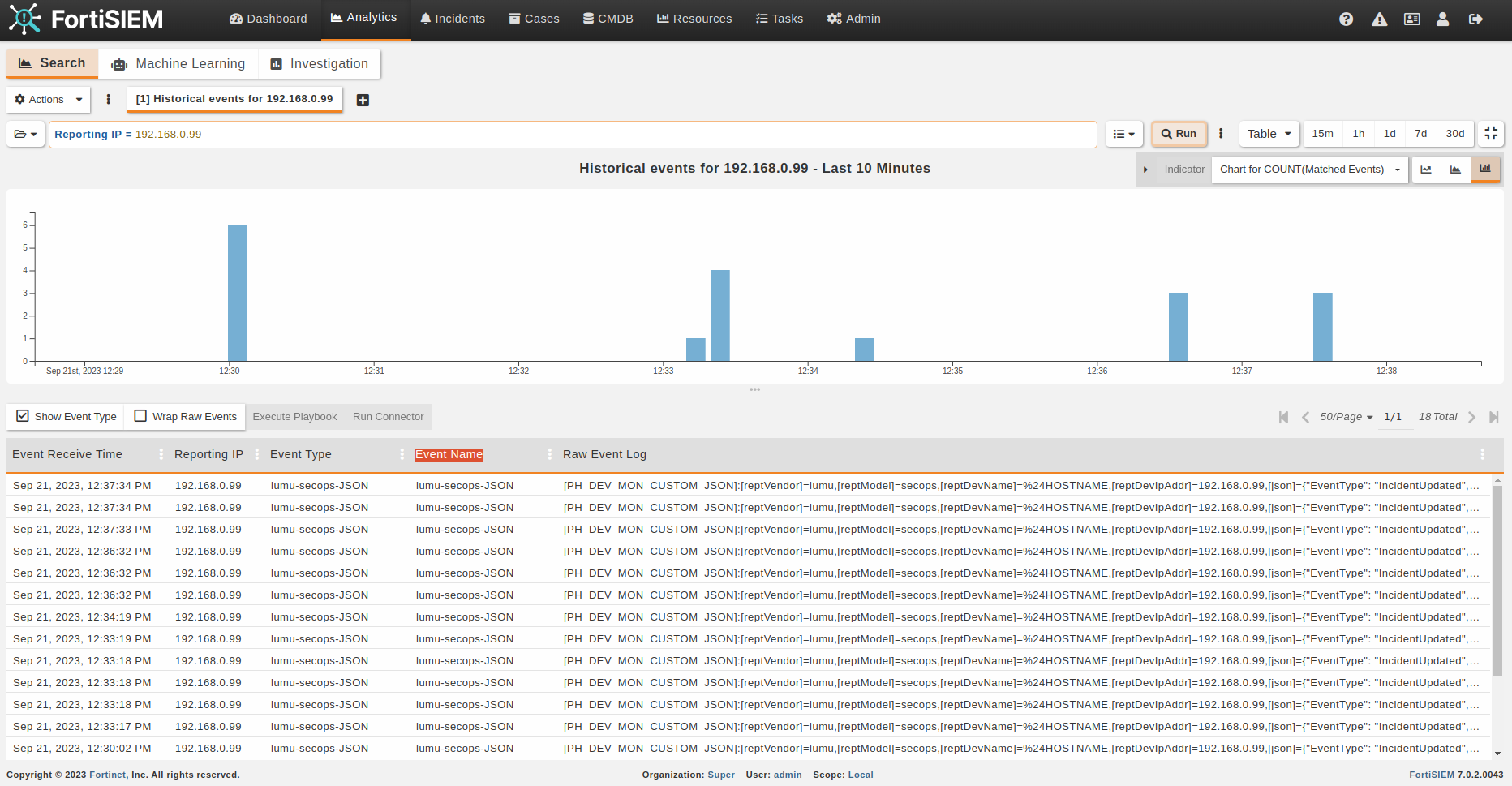 To check the Lumu events in your FortiSIEM deployment, go into your FortiSIEM console to the Analytics menu. Run a search filtering by the used reporting IP or other relevant identifiers.