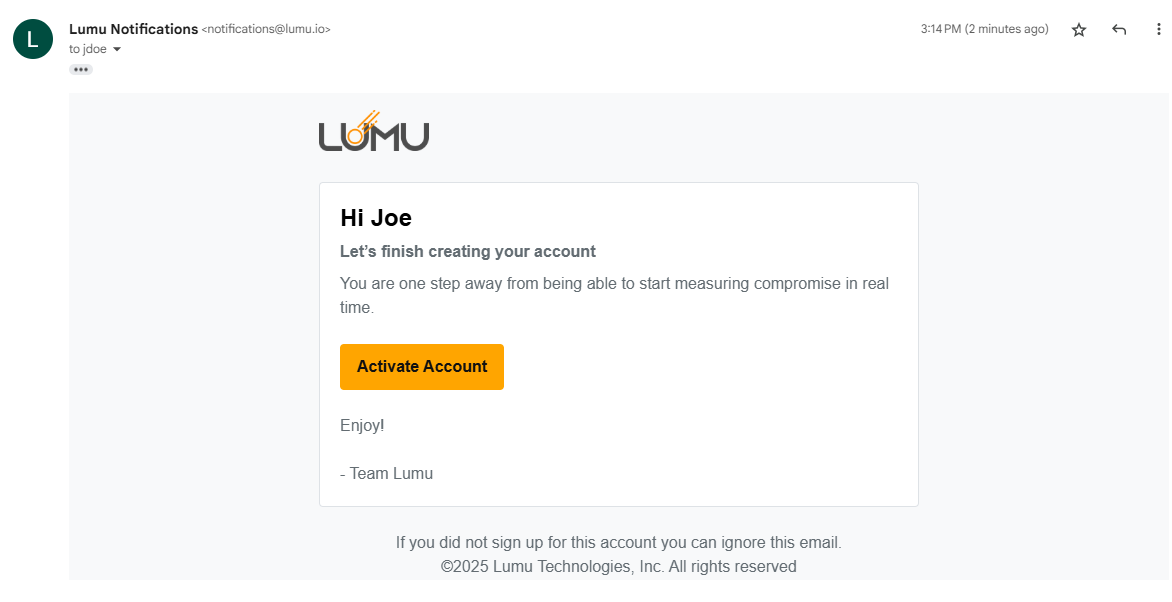 Head to your inbox and look for the confirmation email. If you can’t find it, look for it in your spambox or any other relevant folders. The email will come from the address notifications@lumu.io. Click on the button to Activate your Account.