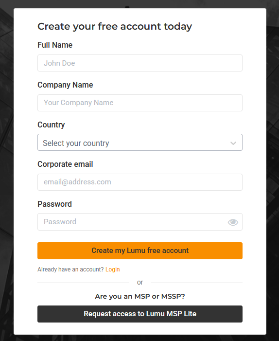 2. There, you will find the account creation form. Provide all the required information, which includes your name, country, a corporate email and a secure password. Then, click on Create my Lumu free account.