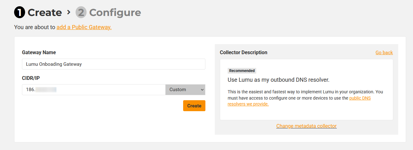 2. This will take you to a screen where you will be prompted to create a public gateway, which is a collector you can deploy very easily. Assign an identifiable name to your gateway, and provide the IP address of the device you want to collect metadata from, and click on Create.