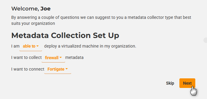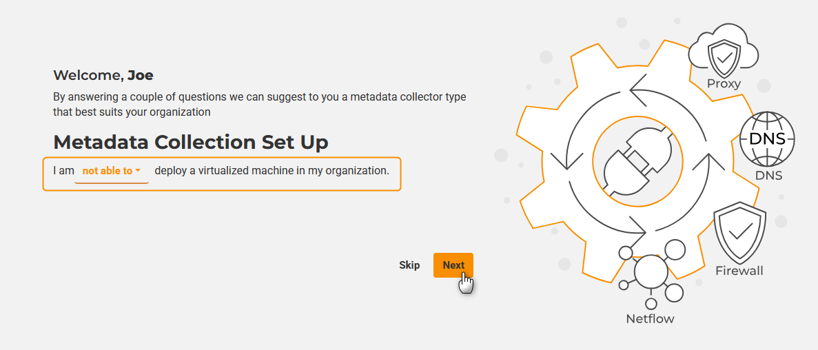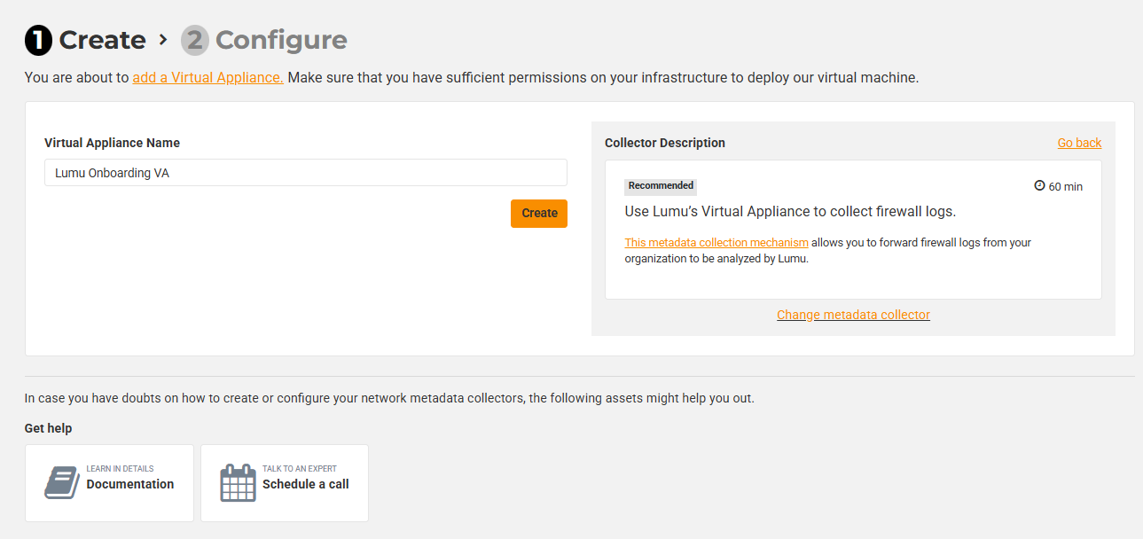 After logging in, you will be able to complete the Lumu Onboarding experience to create your first metadata collector.