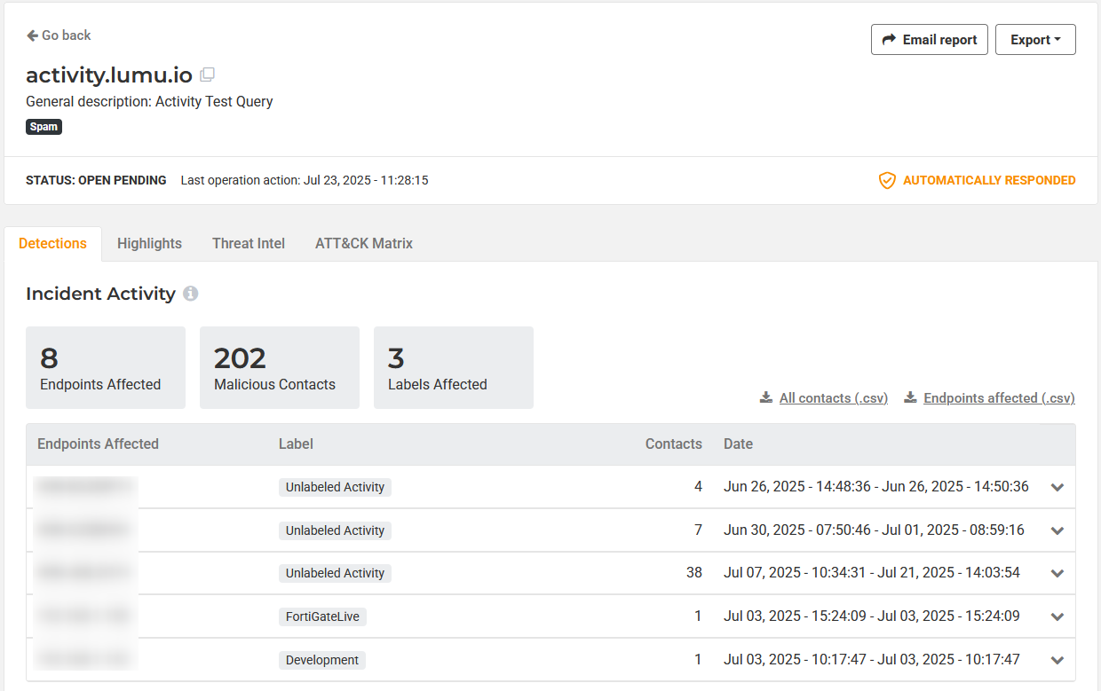 If you click on any incident, you will find additional details such as the affected endpoint, number of contacts, affected labels, and more.