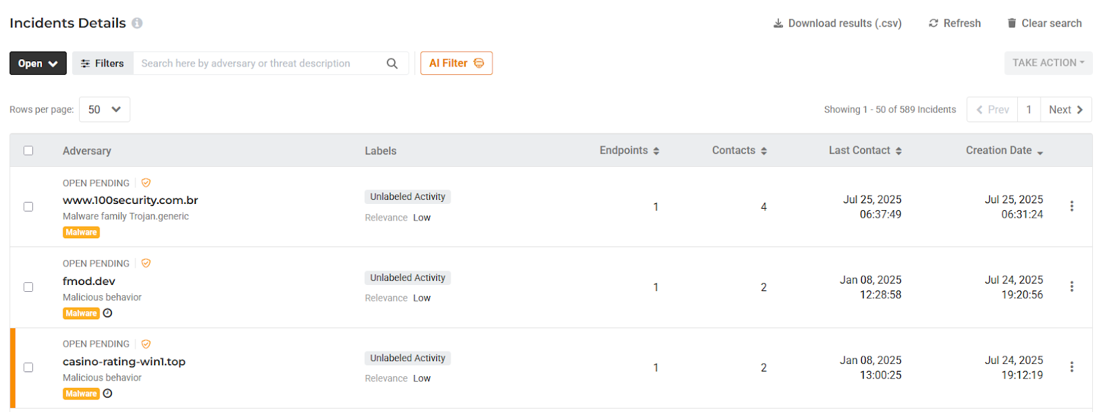 This is the view where you will learn the most about the security incidents your organization is facing and where you will operate them within Lumu. You can learn more about the Incidents view in the following articles: