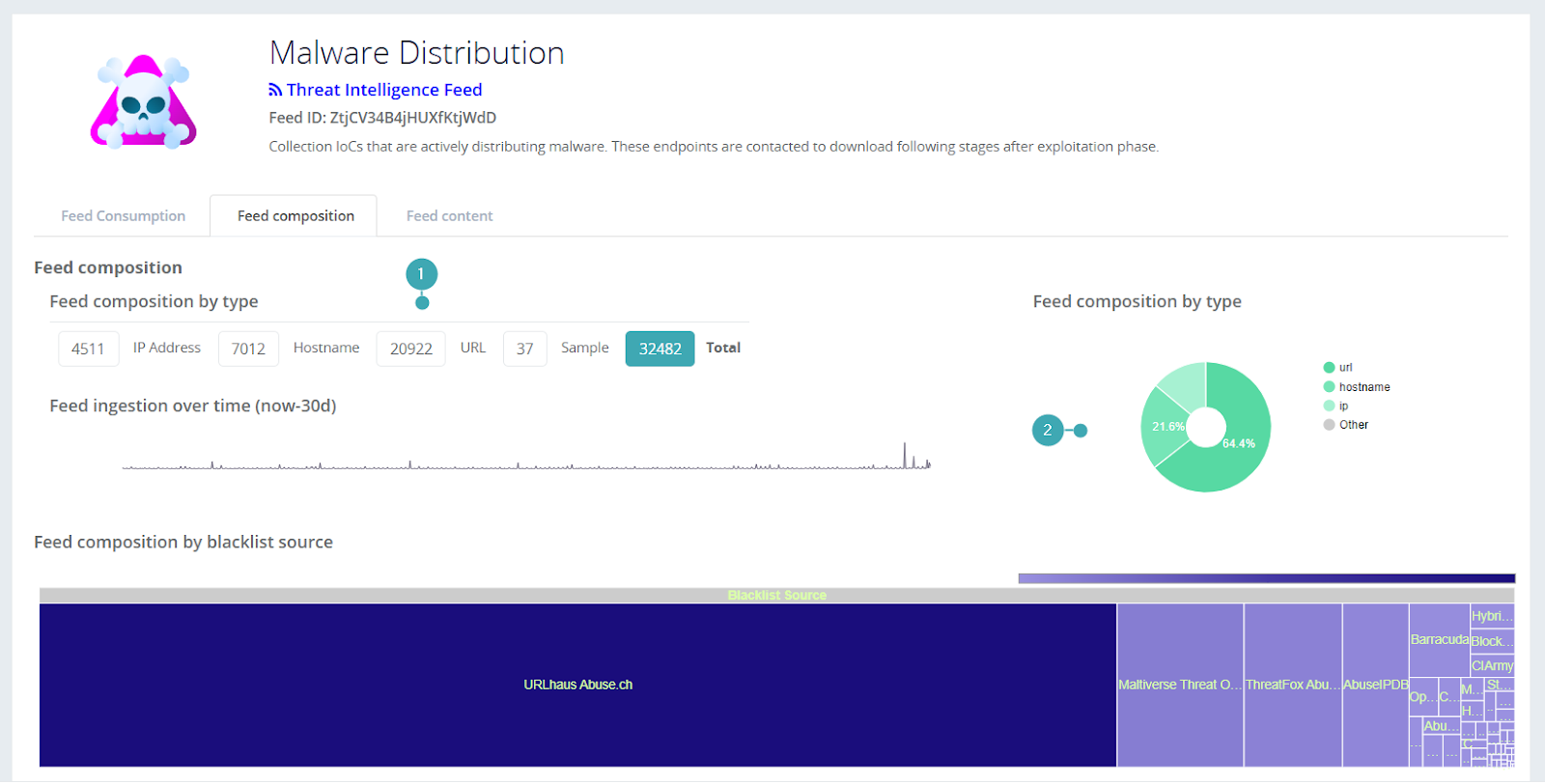 On this view, you can find a detailed overview of the IoCs that make up this feed. You can check the exact Feed composition by type (1) and their distribution in the graph (2), along with other useful information.