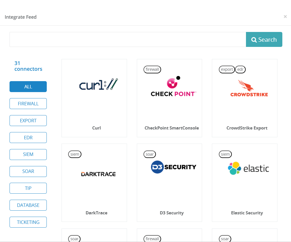 2. Select the connector you need for the integration. There is a wide variety of security solutions in which Maltiverse can be integrated.