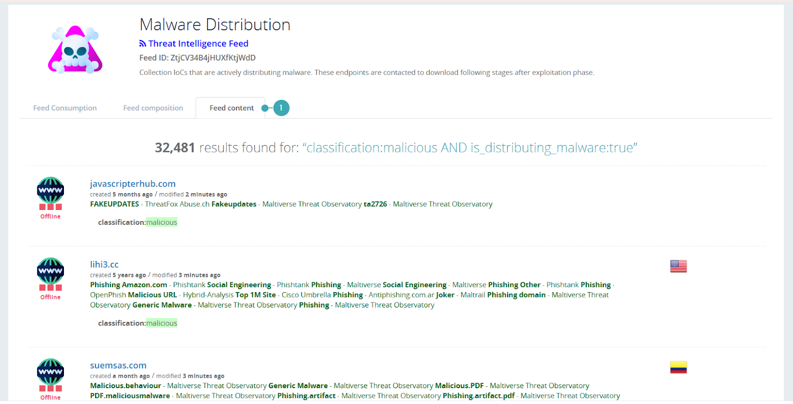 All of this data is processed and continuously refined to form the Threat Feeds, collections of IoCs grouped by their nature or behavior, such as Command and Control activity, malware distribution, malicious IP addresses, TOR nodes, and more.