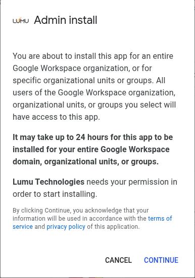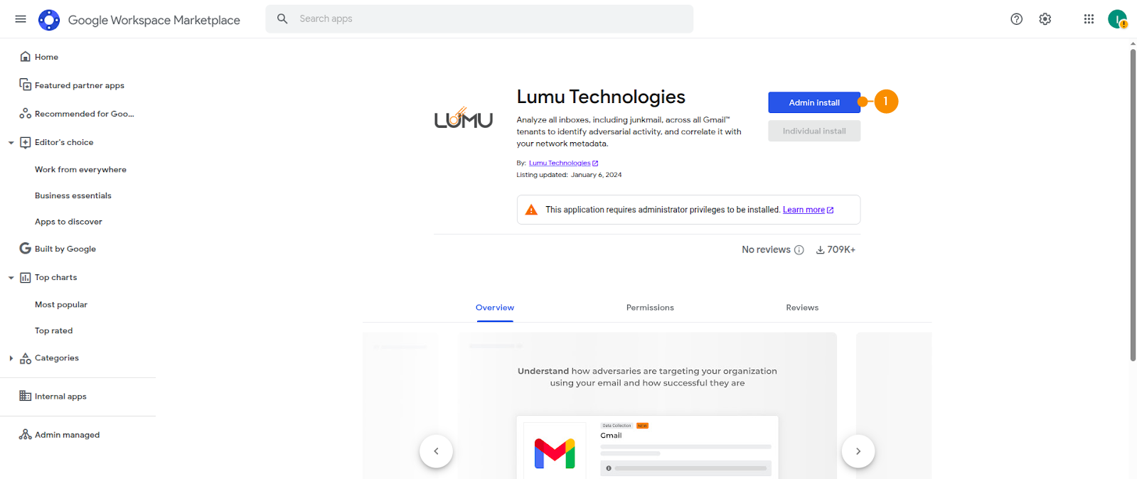 7. After confirming your Google user, you will be redirected to our application in Google Workspace Marketplace. From there, install the Lumu Technologies app by clicking on Admin install (1) This app is only available through Admin install, so make sure you are using an administrator account.