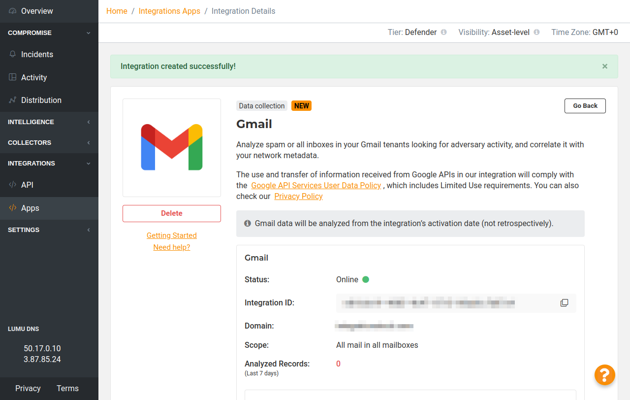 14. Once you finish the integration, the Lumu Portal will display its details.