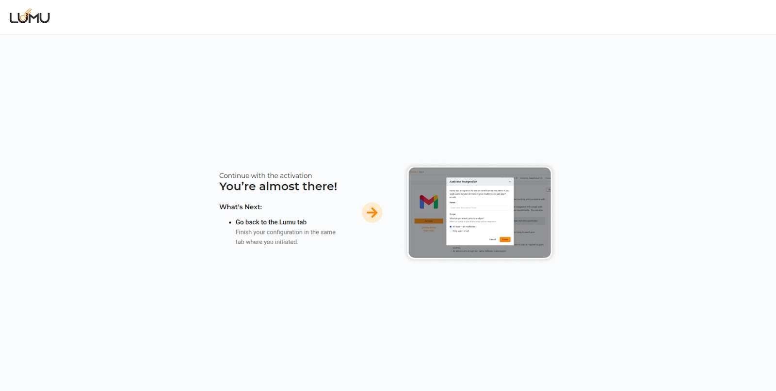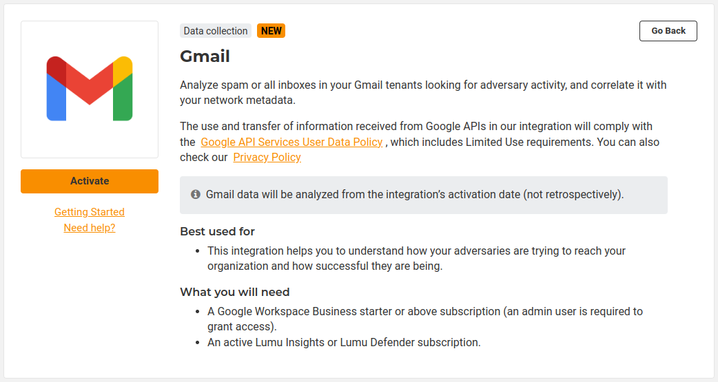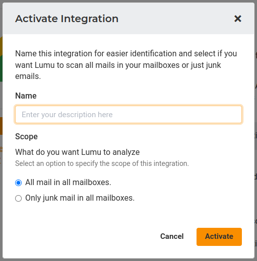 13. Back in the portal, you need to give a description of your integration in Lumu Portal, as well as selecting the scope for mail analysis. Then, click Activate.