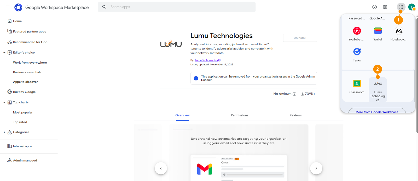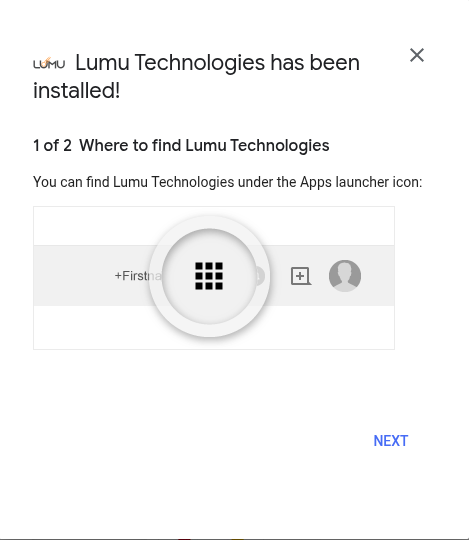 If you miss this step, you can still complete your Lumu setup by opening the Apps launcher (1) and selecting the Lumu Technologies app (2). Then, you can continue from step 12.12. Your web browser will open with the instruction to continue. Follow them by going back to the Lumu tab.