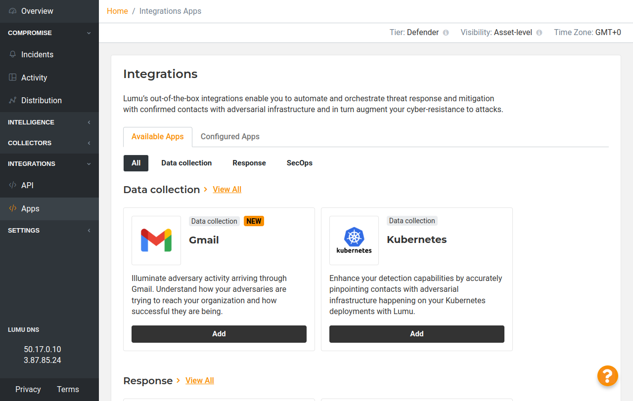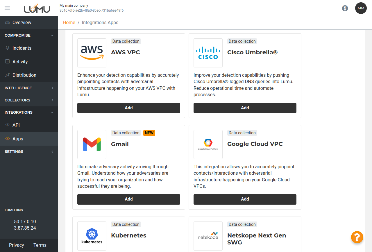 1. Log in to your Lumu account through the Lumu Portal and navigate to the integrations screen.