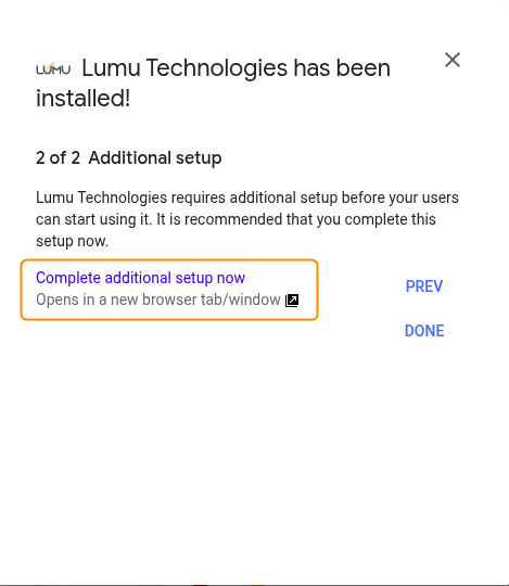 10. You will see a pop-up notifying you that the Lumu Technologies app has been installed. Click Next.